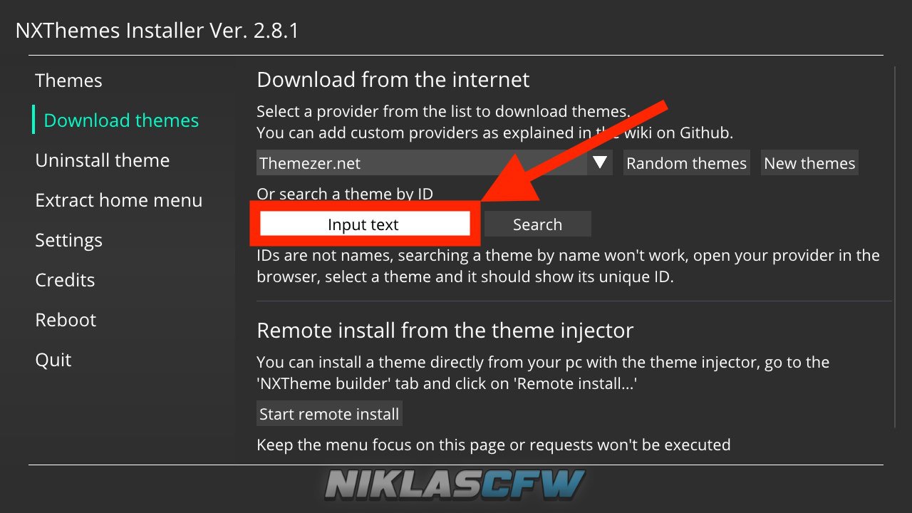 2. Gibt den Code unter Download Themes in das Fenster Input text ein und bestätigt anschließend durch klicken auf Search