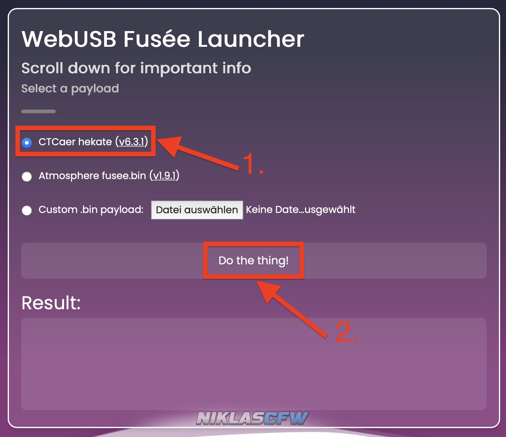 - CTCaer hekate auswählen (andere Optionen nicht verwenden!) und dann „Do the thing!" anklicken.