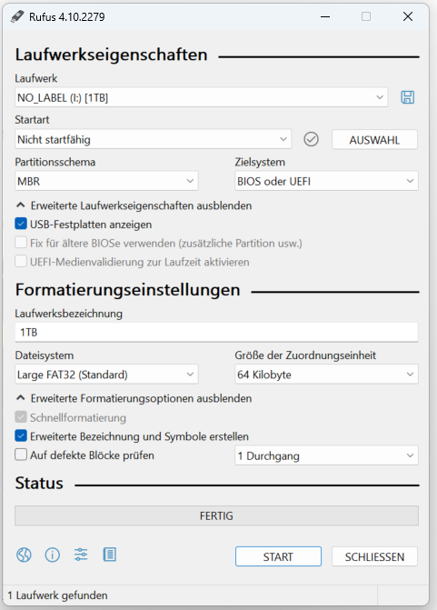 Aktiviere bei 1TB SD-Karten den Haken für USB-Festplatten.